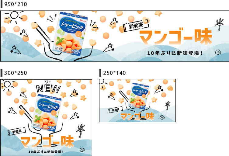 実際に存在する「シャービック」の新味(マンゴー味)が発売されたと仮定して作成した。味がマンゴーなので、夏っぽさやトロピカルな感じを出したかったため、ヤシの実、太陽、海などの素材を用いた。また、新味のフレッシュさを表現したかったので、シャーベットを飛び散らせてインパクトを与えるデザインにした。