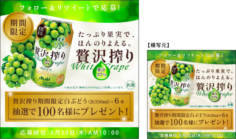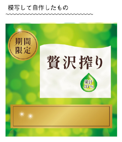 メッシュツールを用いての「果汁37%」の雫の表現や、ゴールドの背景、キラキラの作り方、布のしわ風のホワイト背景など、illustratorとPhotoshopでできるところを使い分け、調べに調べて制作したため、とても時間がかかったが、とても勉強になった。